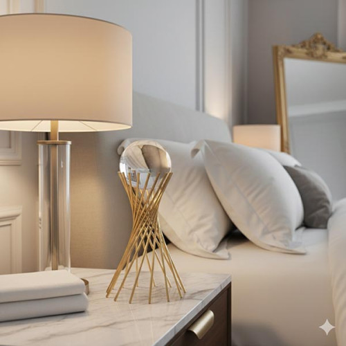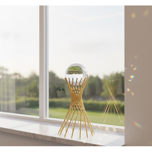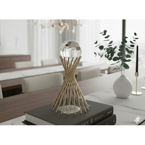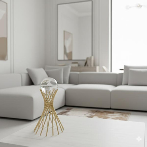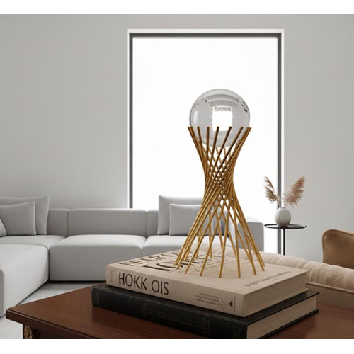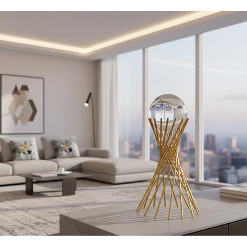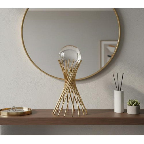 Design elegante com estrutura dourada e esfera de vidro, ideal para decoração de interiores.