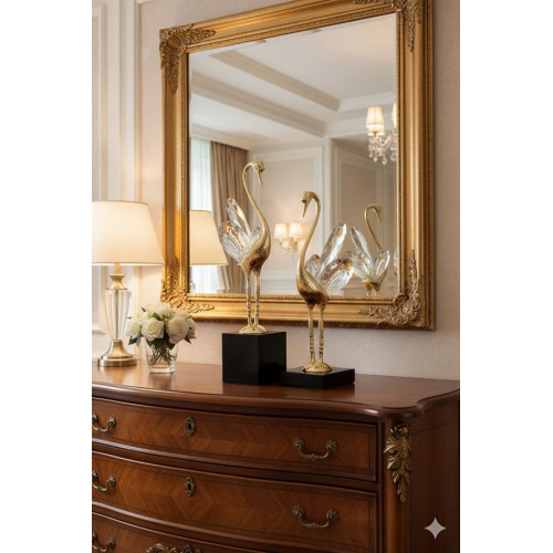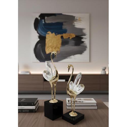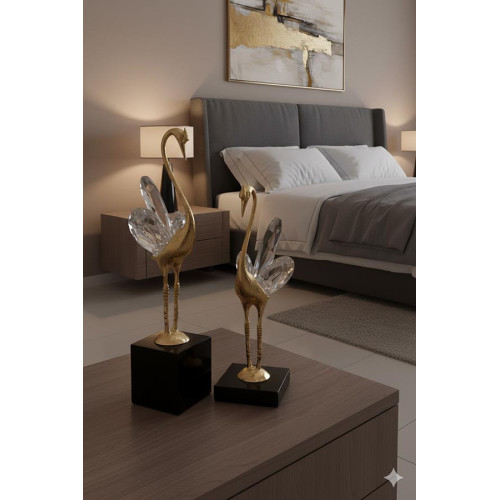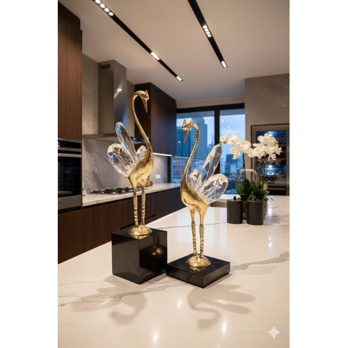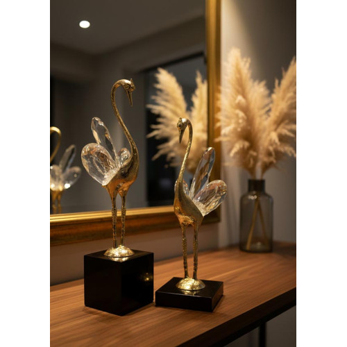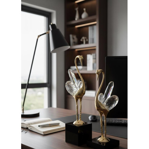 Produto de decoração elegante e sofisticado com dois cisnes dourados e asas de cristais, ideal para valorizar ambientes internos.