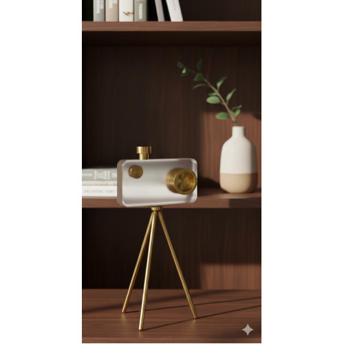 Enfeite De Vidro Para Decoração de Interiores - Máquina Fotográfica de Vidro Com Tripé Dourado - Embalagem: 1x12=12. Peça decorativa elegante em formato de máquina fotográfica feita de vidro com tripé dourado, ideal para decoração de interiores. Artigo decorativo versátil que combina com diferentes estilos de decoração, perfeito para ambientes como escritórios, salas ou estúdios fotográficos. Design exclusivo que serve tanto como elemento decorativo quanto como item de coleção para entusiastas de fotografia.