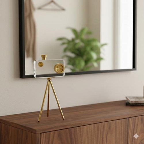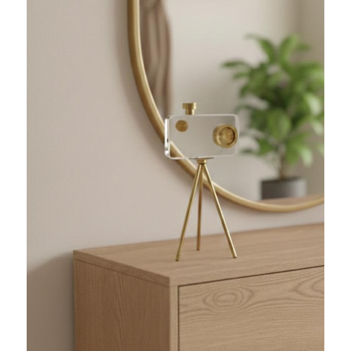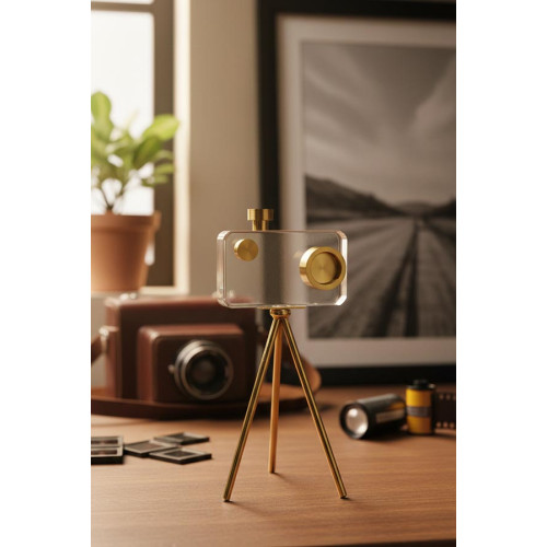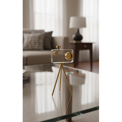Etiquetas: Enfeite De Vidro, Decoração de Interiores, Máquina Fotográfica de Vidro, Tripé Dourado, Elegante, Item Decorativo, Versatil