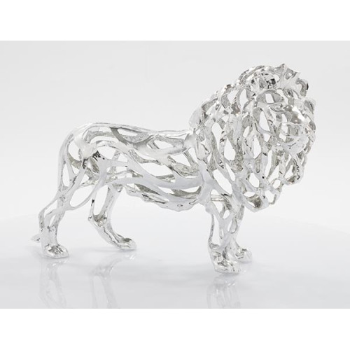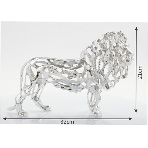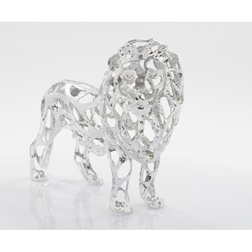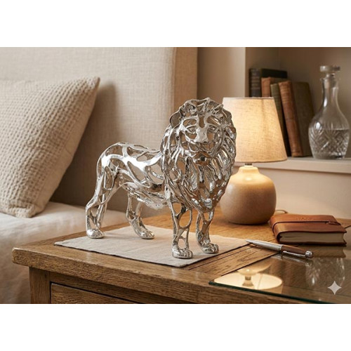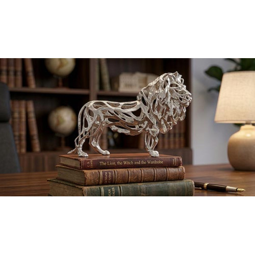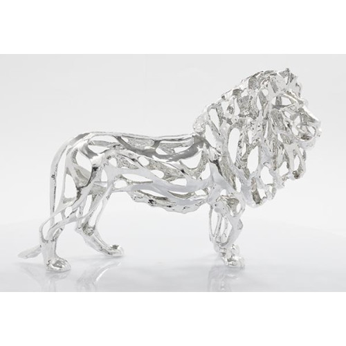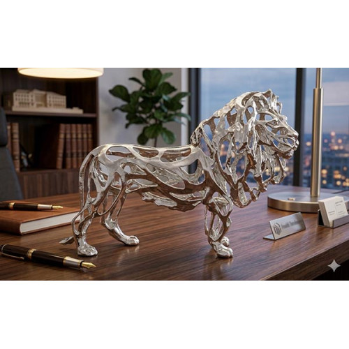 Peça decorativa exclusiva em metal prata com design sofisticado de leão com estrutura vazada, ideal para decoração de interiores.